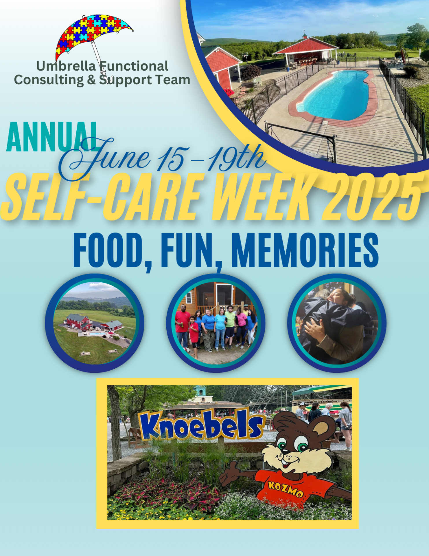Self-Care is important at Umbrella FCST. Each year we pack up and go spend time on ourselves. One week of rest, relaxation, fun, spirit, and taking care of ourselves. This year we will spend our SCW near Knoebel's Amusement Resort.