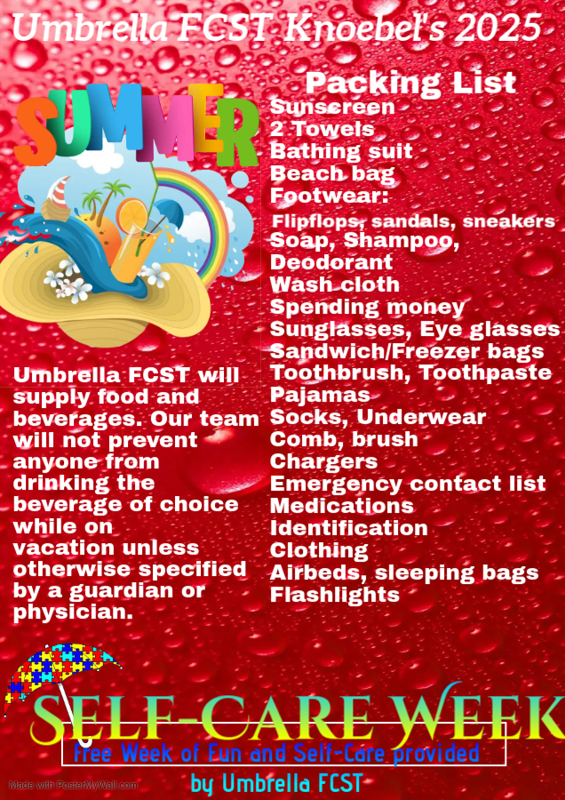 A: Only upon request. Contact the office ahead of time as Umbrella can coordinate this for you ahead of time. 1) Home and Community-based services are available in waiver recipients' homes and local community. 2) Umbrella FCST is closed during Self-Care Week and this retreat is for just that: Self-Care.